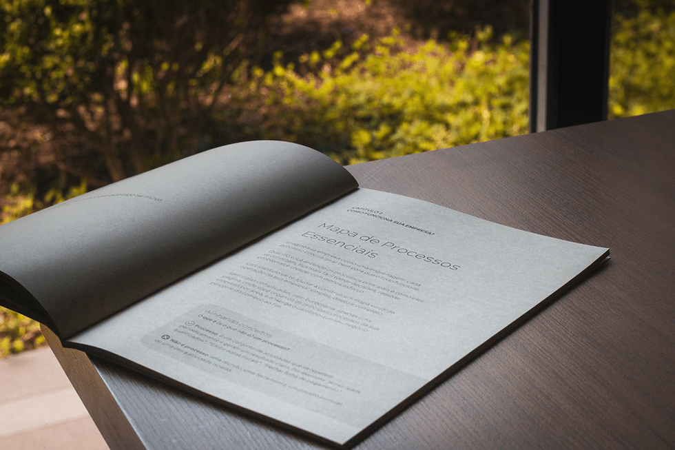 Book estruturado com 62 páginas em papel Pólen Soft 80g/m² e capa brochura premium 250g/m², formato 170mm x 240mm. Desenvolvido como instrumento prático de apoio empresarial.